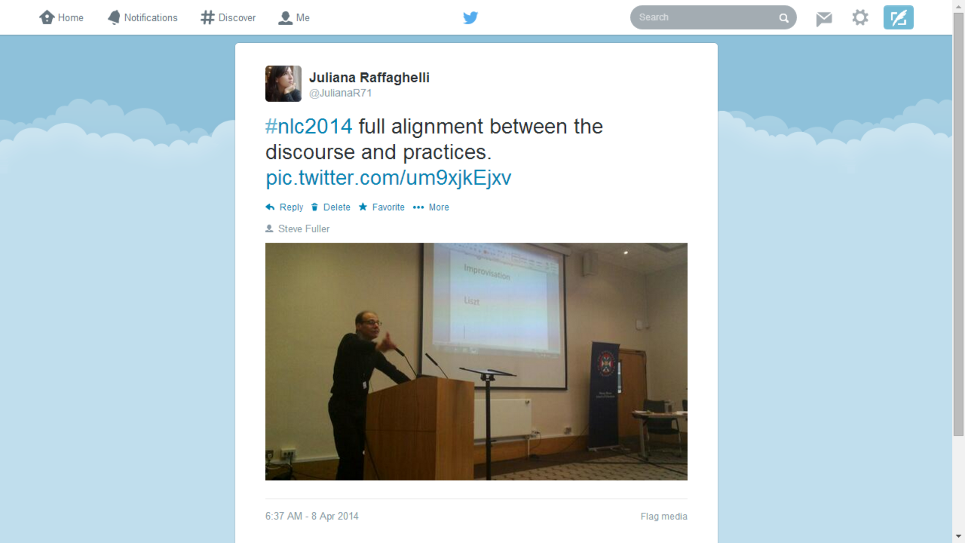 …”La experiencia de continuidad (de unir tiempo y espacio), es decir, de estar en contacto con colegas durante hotseats y más tarde durante la conferencia, cada dos años; así como la posibilidad de interactuar, construyendo ideas sobre las ponencias, a través de Twitter of FB, y más tarde durante intensas conversaciones, me ayudaron a hacerme una idea clara y profunda de lo que quiere decir el aprendizaje (profesional) en red. Eso es todo: la coherencia entre las ideas de la conferencia NLC y las prácticas que se llevan a cabo. Algo más bien raro en esto días….Y ese es el tercer elemento revolucionario de la conferencia (siendo el primero un uso del tiempo diferente, y el segundo, un espacio construido a través de las interacciones”): una aproximación basada en cuestionarnos por lo que hacemos y como lo hacemos (investigación educativa), alineando discursos y prácticas”….