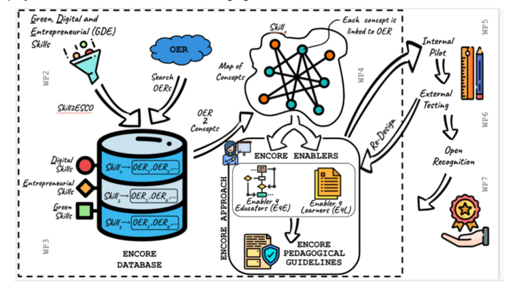 The work that will be carried on can be described in phases. The universities involved will have a great responsibility in Phase I of the project– data-driven / technology, with UNIPI in charge of defining the GDE (Green, Digital and Entrepreneurial) skills (WP2) and USAL responsible of the collaboration with the technological providers (mainly BMU, FBK) (WP4). In Phase II (expert-driven / pedagogy) UNIPA will take care of defining the ENCORE approach (WP5). All the educational providers, led by CHA, will be equally involved in the internal and external testing (WP6). The picture below better summarise it: