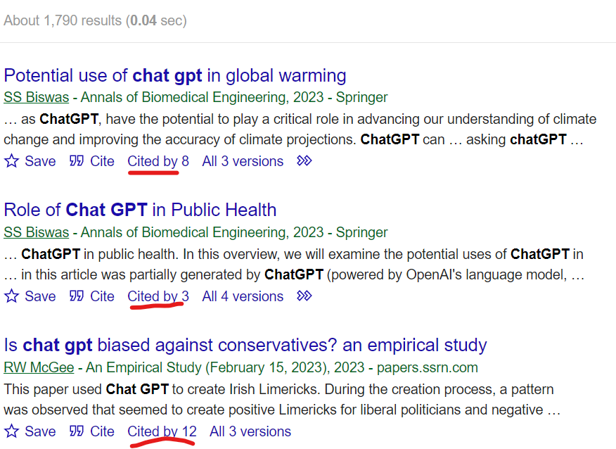 Una rápida búsqueda en Google Scholar ayer, 11 de Abril, nos arroja 1790 resultados para 2023, de artículos escritos en varios ámbitos científicos. En la imagen que sigue, observamos el caso de la ingeniería biomédica, y de las ciencias sociales, pero recorriendo los primeros 10 resultados del listado encuentro ejemplos de los estudios literarios, de la biblioteconomía, la salud pública, medicina clínica. Lo que impresiona en todos estos casos es que estos artículos ya tienen entre 3 a 12 citaciones, lo que significa que hay como mínimo 3 a 12 artículos escritos y publicados tocando el tema.